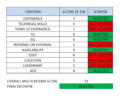 Example – In the area of resource management, while hiring the team members from a pool of available resources for a new project, rather than using simple entry criteria to select the team member, a project manager can use the Multicriteria Decision Analysis technique to select better team members based on an array of criteria relevant to the project. A matrix can be built in terms of experience, technical skills, years of experience, IQ, EQ, internal or external, availability, cost, location, leadership, age, and many more factors deemed useful for the project.